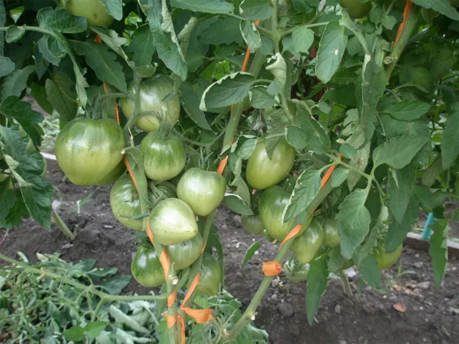 Поэтому кусты нуждаются в подвязке к опорам. Подвязывать рекомендуется не только стебли томатов, но и плодовые кисти, чтобы они не сломались под тяжестью урожая. Кусты образуют крупные листья и много завязей, собранных в гроздья по 3-6 плодов.
