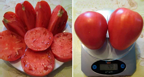 Характеристика и описание плодов впечатляют: средний вес помидоров составляет 250-350 г. Даже на самых верхних кистях формируются довольно крупные томаты весом до 150-200 г, на нижних кистях созревают настоящие гиганты, вес которых достигает 500-700 г и больше. Чтобы плоды соответствовали описанию, растениям необходимо обеспечить правильный уход.