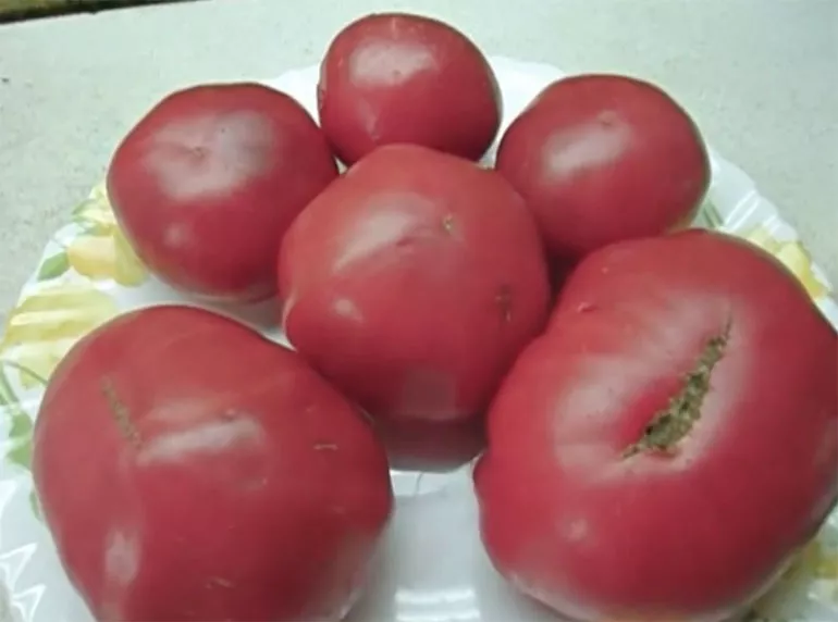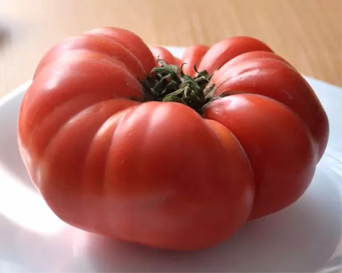 - Плоды. Сорт среднеспелый, плоды плоскоокруглые, ребристые, красивые, насыщенно-розовые, многокамерные, с небольшим количеством семян. На фото их можно спутать с сортами Уральский или Сибирский гигант, но у них томаты малиновые или ближе к красному цвету. Средний вес плодов – 350 г. В нижних кистях помидоры большие, на верхушке куста – значительно мельче. Лежкость и товарность хорошая. Вкус помидоров сладкий, мякоть на разломе зернистая. Плоды хороши в свежих и зимних салатах. Из них получается отличный сок – густой, содержит мало кислоты для приготовления борщей, но выпивается с удовольствием.