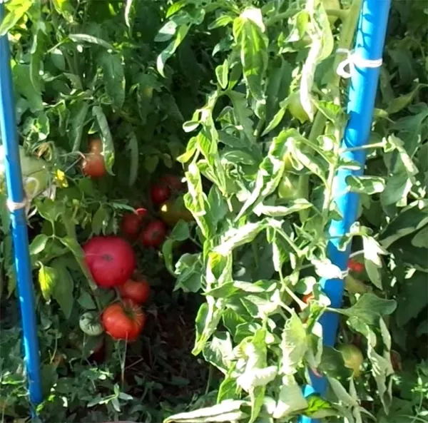- Куст. Томат сорта Розовый гигант – индетерминантный, с неограниченной силой роста. Формирует высокий среднеоблиственный куст с побегами крепкими, но не способными без подвязки выдержать вес плодов. Высота куста на огороде существенно ниже, чем в теплицах. На открытых грядках нередко происходит самопроизвольное вершкование, когда без участия огородника томат прекращает рост из-за усыхания макушки.