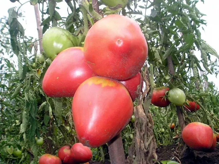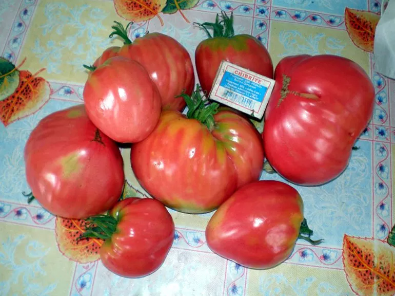 Кожица тонкая, розового цвета. Масса одного помидора достигает 800-1000 г. Средняя масса 200-400 г. В кисти до 6 плодов. Средняя урожайность – 4-6 кг.