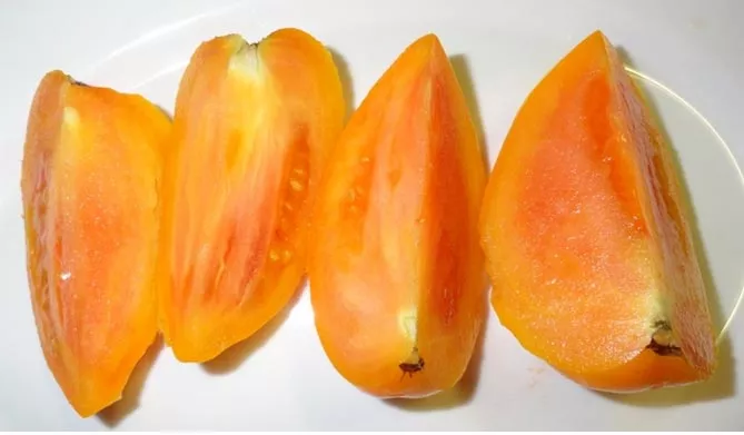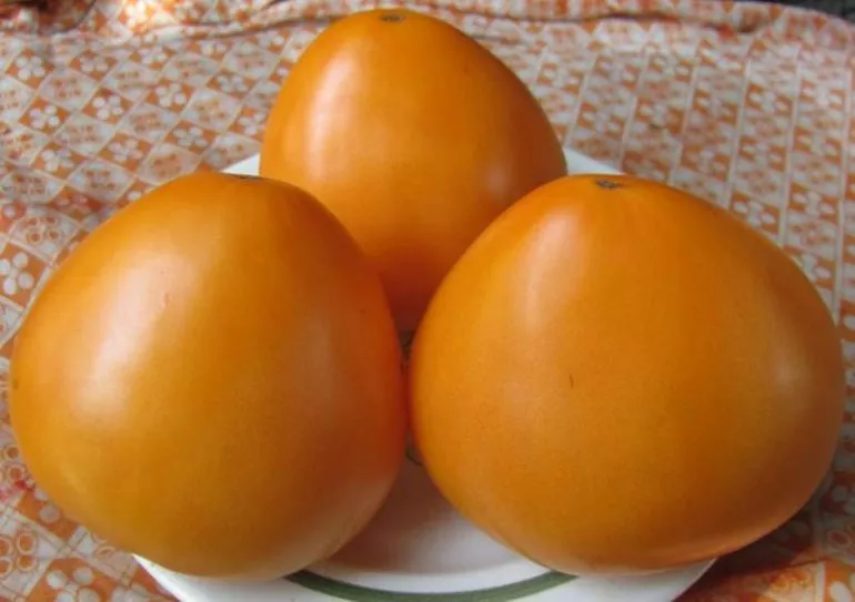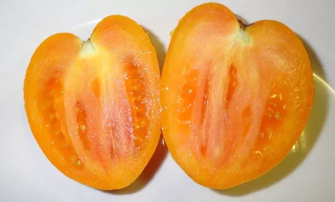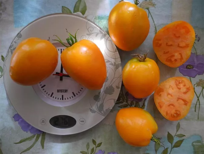 Плодоношение обильное – 5-7 кг помидоров с м². В каждой кисти в среднем 6 плодов. Томаты в форме жёлто-оранжевого сердца, средней массой 120 г. Транспортабельны. Имеют отличный товарный вид. Мясистые, плотные. Семенных пазух мало. Кожица не толстая, блестящая. Семена пригодны для посева. Плоды подходят для различных видов обработки, употребления в свежем виде.