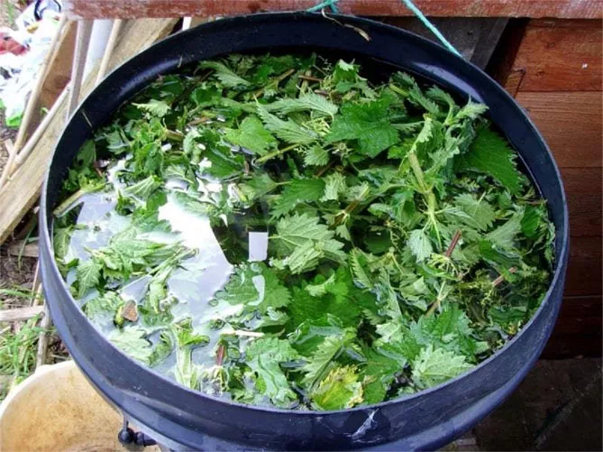 Наиболее полезные настои можно получить из свежей крапивы, при необходимости используют сухую траву. Закваску нужно сделать, как описывалось в базовом рецепте. Поливать под корень и по листьям все растения, нуждающихся в азоте и микроэлементах.