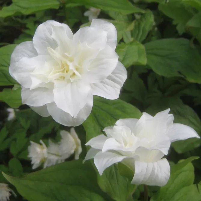 Великолепный сорт махрового триллиума «Флоре Плено» грандифлора или крупноцветкового вида (Trillium grandiflorum Flore Pleno) отличается красивыми цветками чисто-белого цвета. Период цветения: март-апрель. Высота – 25 см.