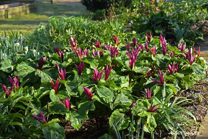 Чтобы создать приятное зрелище, можно играть с контрастами, посадив рядом с красными триллиумами магнолии, белый дерен или поздноцветущие красные камелии с белоцветущими триллиумами.