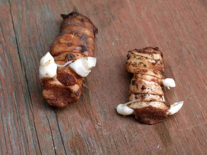 - С помощью ножа продезинфицированного для предотвращения распространения болезней, разделите корневище на несколько фрагментов. У всех должен быть спящий глазок.