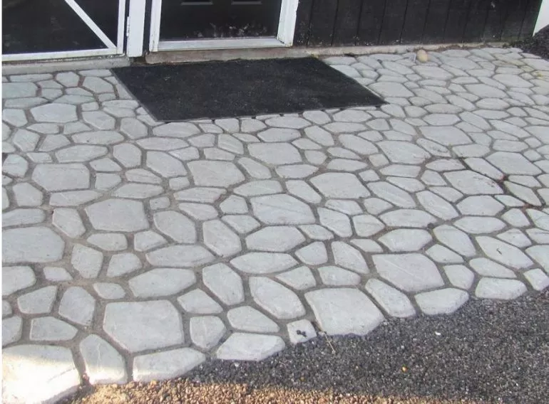 Фото. Виды садовых дорожек, выполненные с использованием различных форм и красителей для бетона при производстве плитки.