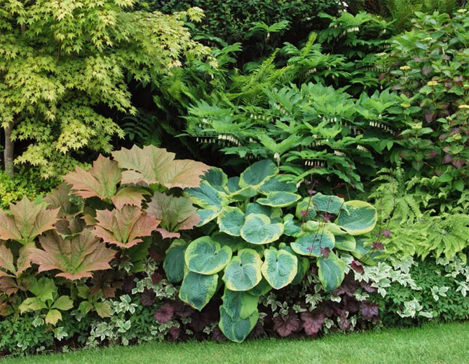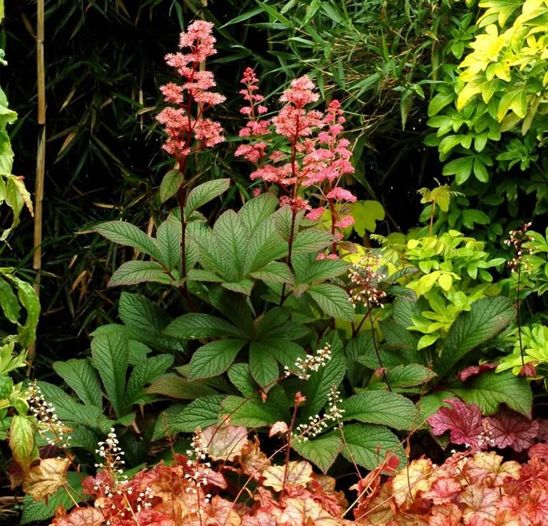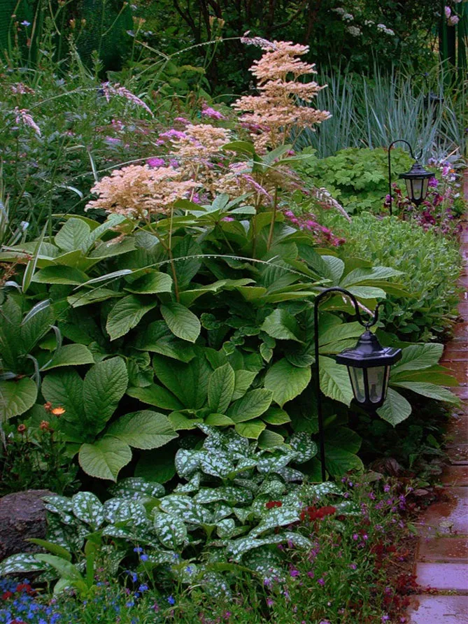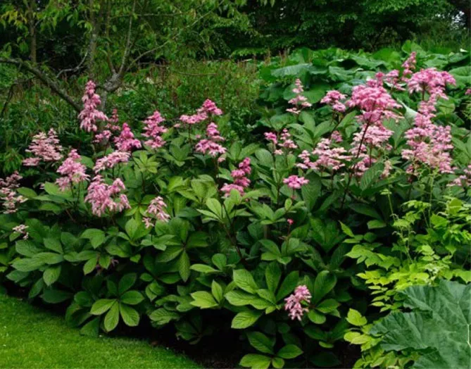 Роджерсия может украсить и романтическую многолетнюю клумбу со следующими растениями: