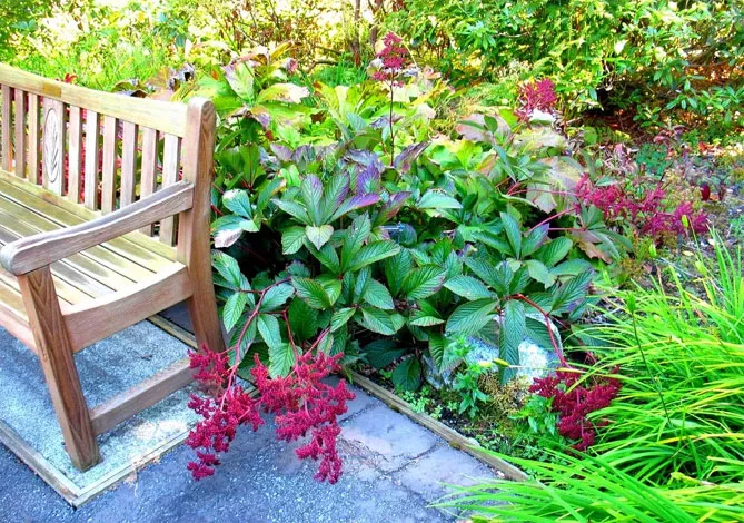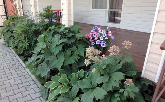 Можно смело назвать роджерсию «архитектурным» растением: ее листья создают в саду сильный структурный акцент. Это хороший вариант для создания современного стиля.