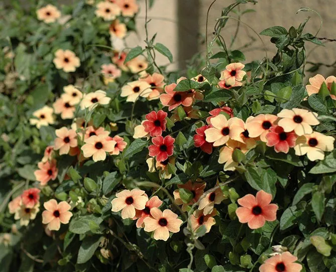 Тунбергия является чрезвычайно обильноцветущим растением. В теплую и солнечную погоду развивает настоящие цветочные каскады. Независимо от того, является ли растение классическим видом тунбергии с желтыми, оранжевыми, пастельными цветами или совершенно новым сортом, цветущим розовыми цветами – все лето лианы создают плотную завесу из листьев с веселыми, яркими цветами на их фоне.