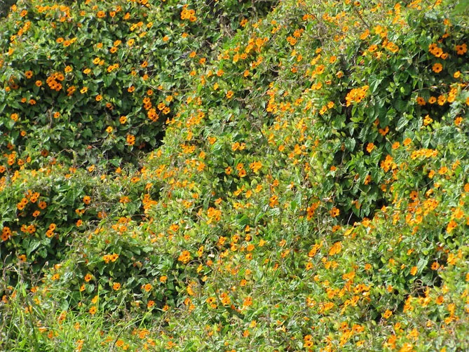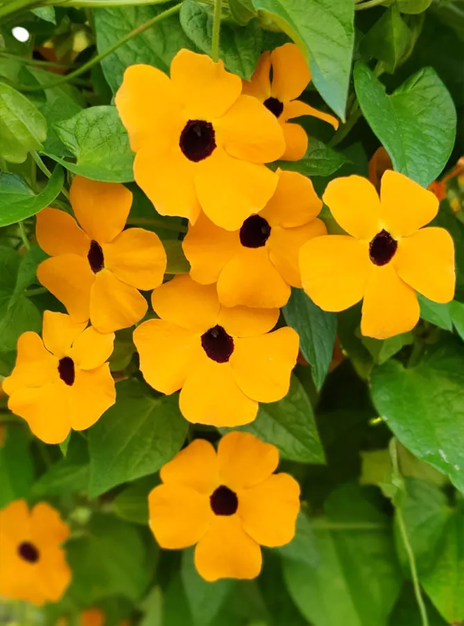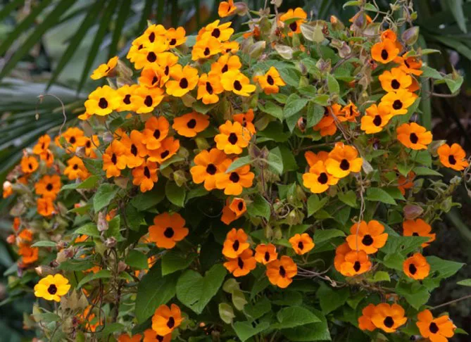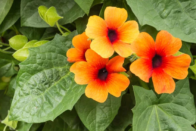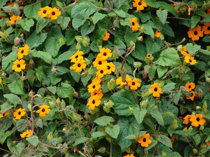 - Тунбергия крылатая (лат. Thunbergia alata) – красивая лиана, ценится за ярко-оранжевые цветки с темным центром и темно-зеленые зубчатые матовые листья.