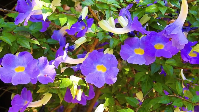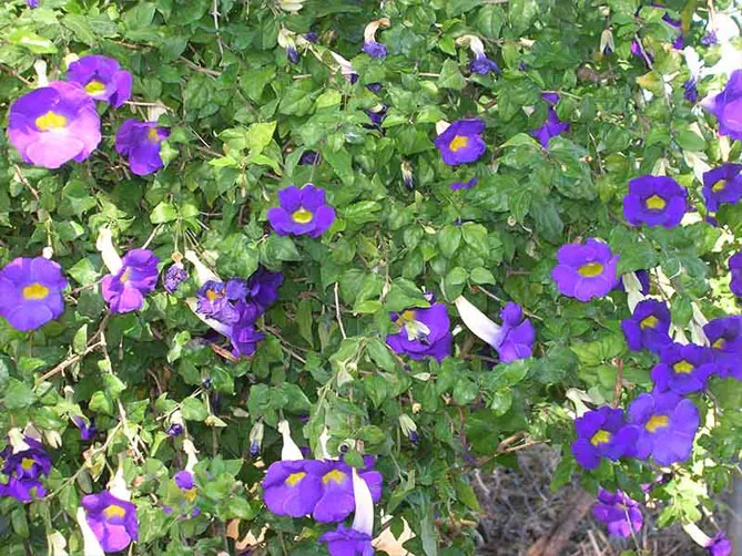 Одна из самых декоративных культурных лиан – тунбергия, известна своими длинными побегами, красивыми листьями и чрезвычайно красочными крупными цветами. В наших климатических условиях обычно это однолетнее вьющееся растение с побегами, достигающими длины 150 см. Мы расскажем, как посадить цветок тунбергия, про выращивание и уход, покажем фото видов, варианты применения в саду и на балконе.