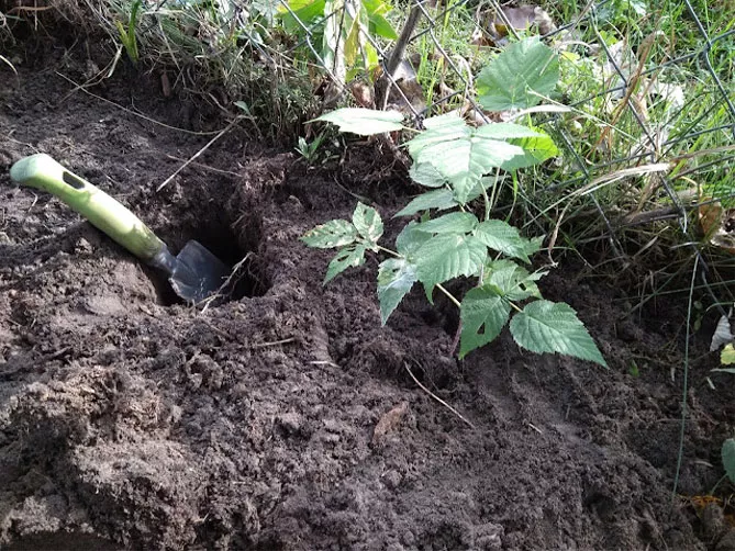 - Затем выкапывают ямки. Лучшая глубина посадки малины – 20 см. Саженцы в контейнерах или тюках сажать намного удобнее – просто помещаете весь корневой ком в вырытую ямку, прикройте его почвой. Сажать малину с голыми корнями сложнее.