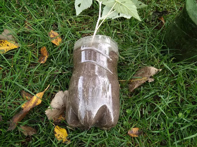 Первые несколько дней емкости ставим в тень, чтобы малина не засыхала на солнце. Можно отнести их в теплицу, где они не попадают под прямые солнечные лучи и где влажность выше, чем на улице. Теперь рассаду нужно регулярно поливать и изредка подкармливать жидкими удобрениями. Сажаем, когда корневая система хорошо разрослась. Разрежьте пластиковую бутылку, поместите малину в заранее подготовленные ямки и обильно полейте. Расстояние между растениями должно быть не менее полуметра.