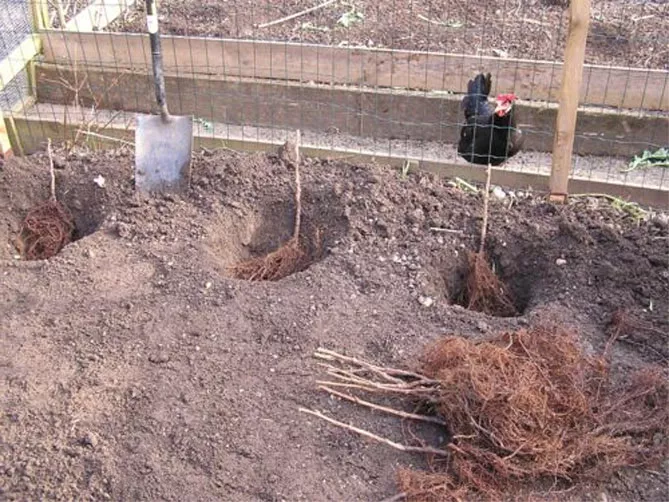 - Намечают места ямок. Если посадить слишком густо, кусты интенсивно плодоносить не будут. Саженцы помещают в лунки на расстоянии 40 см между кустами, 150 см между рядами.