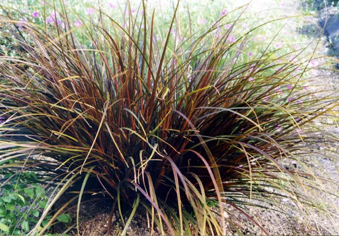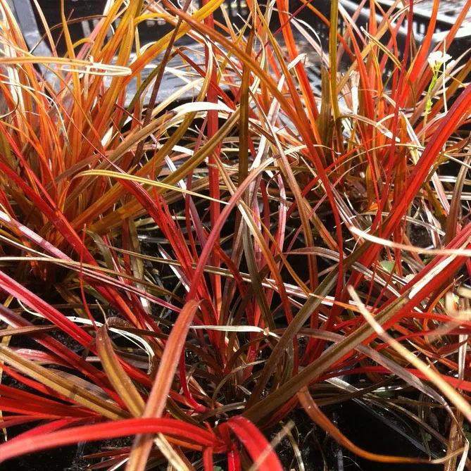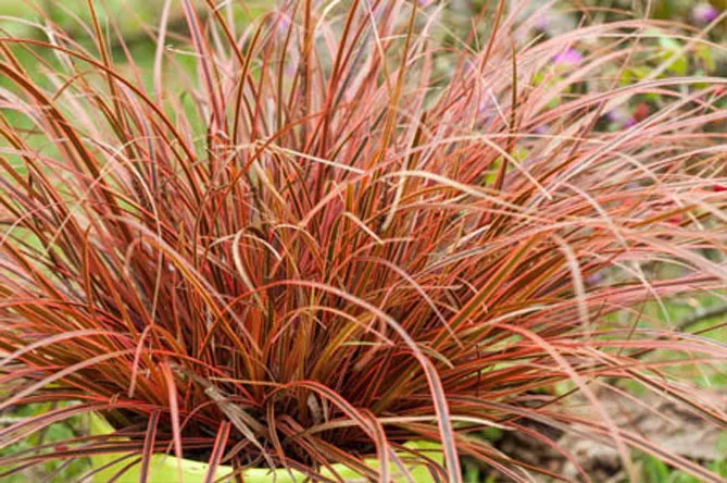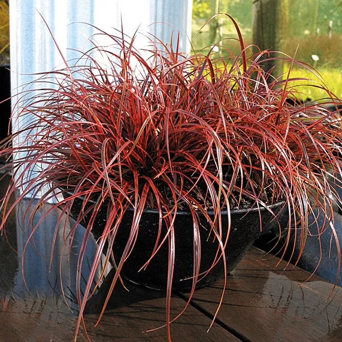 Унциния рубра – это компактный, густой, изящный многолетник с травянистой внешностью. Он отличается очень декоративными лентовидными листьями оранжево-красного или бронзово-фиолетового цвета. Летом дополнительным украшением служат черные соцветия, контрастирующие на фоне ярко-красных листьев. Это похожее на осоку растение в саду используют в оформлении солнечных клумб, прудов, альпинариев.