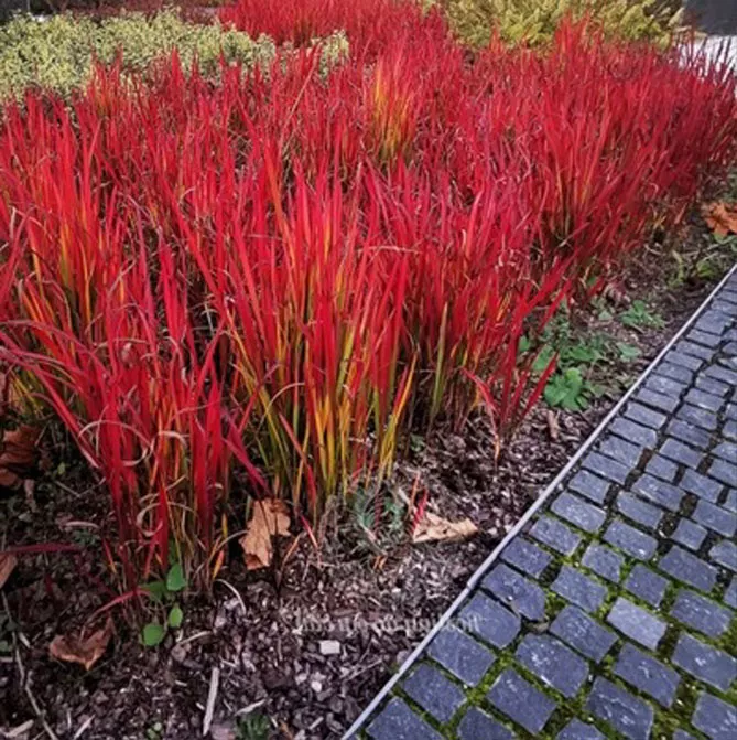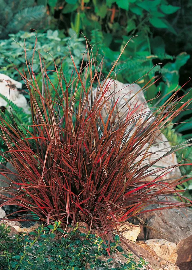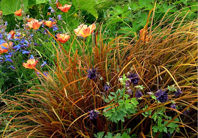 Палитра теплого цвета листвы этой травы «разбудит» растения, сопровождающие его во влажных местах: