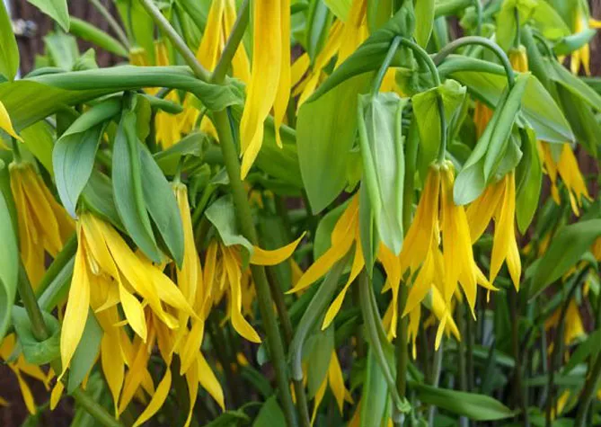 Самый популярный вид Увулярия крупноцветковая цветет с апреля по май. Высота – 40 см. Вид имеет красивые цветы в виде ниспадающих колокольчиков ярко-желтого цвета.