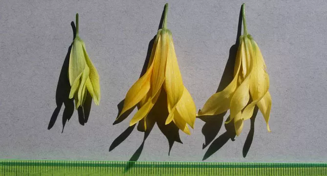 - Цветы. Период цветения увулярии: весна (апрель-май). Цветы появляются на концах стеблей, которые слегка изгибаются под их весом. Бывают одиночными или располагаются парами, на длинной цветоножке. Обычно они желтые, трубчатые, длиной 4-5 см, наклонены к земле, образованы 6 длинными свободными листочками околоцветника (3 чашелистика и 3 лепестка одинакового внешнего вида), каждый из которых красиво закручен по спирали. Содержат нектар, их ценят пчелы, шмели, обеспечивающие опыление.