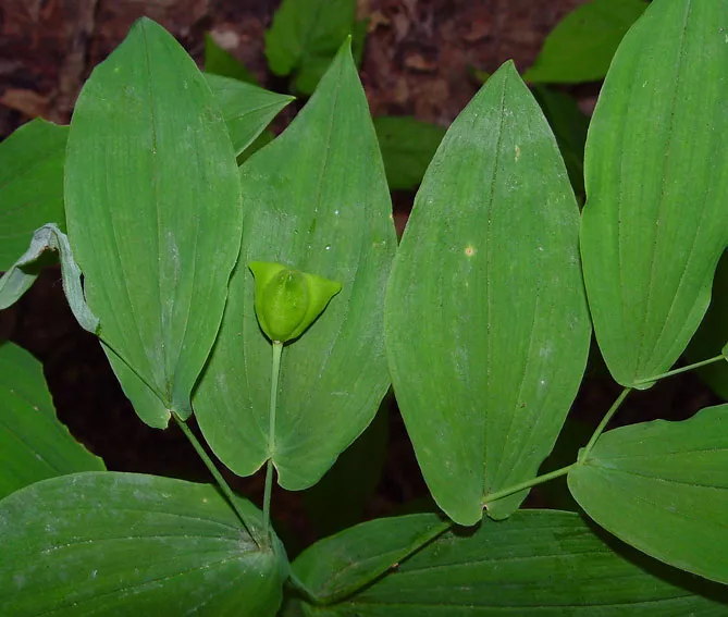 Фото. Листья и плоды увулярии. Молодые побеги, начинающие рост весной, с развитой листвой и капсулой, содержащей семена.