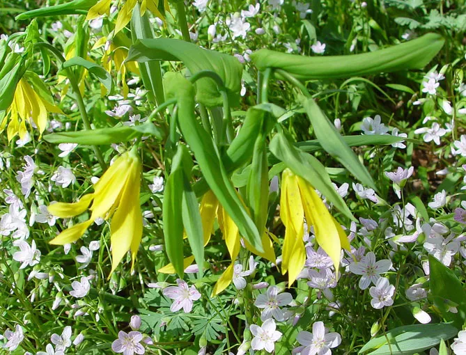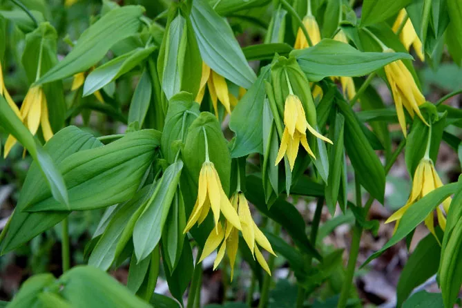 Увулярия крупноцветковая (Uvularia grandiflora) – травянистое многолетнее растение, произрастающее в Северной Америке, с красивой нежно-зеленой листвой, напоминающей листву купены. Весной, в мае на изогнутых стеблях распускаются великолепные желтые цветы-колокольчики, склоняющиеся к земле. Этот цветок ценят за невероятно нежные, скромные цветы, состоящие из шести длинных спиральных лепестков.