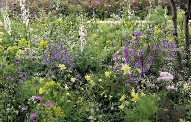 Фото. Хороший пример естественной комбинации растений: вечерница матроны, василисник водосборолистный, фенхель, аквилегия золотистая «Yellow Queen», наперстянка пурпурная «Альба», молочай Уоллиха, купырь лесной, дудник лесной, астранция крупная «Шэгги», бодяк приручейный.