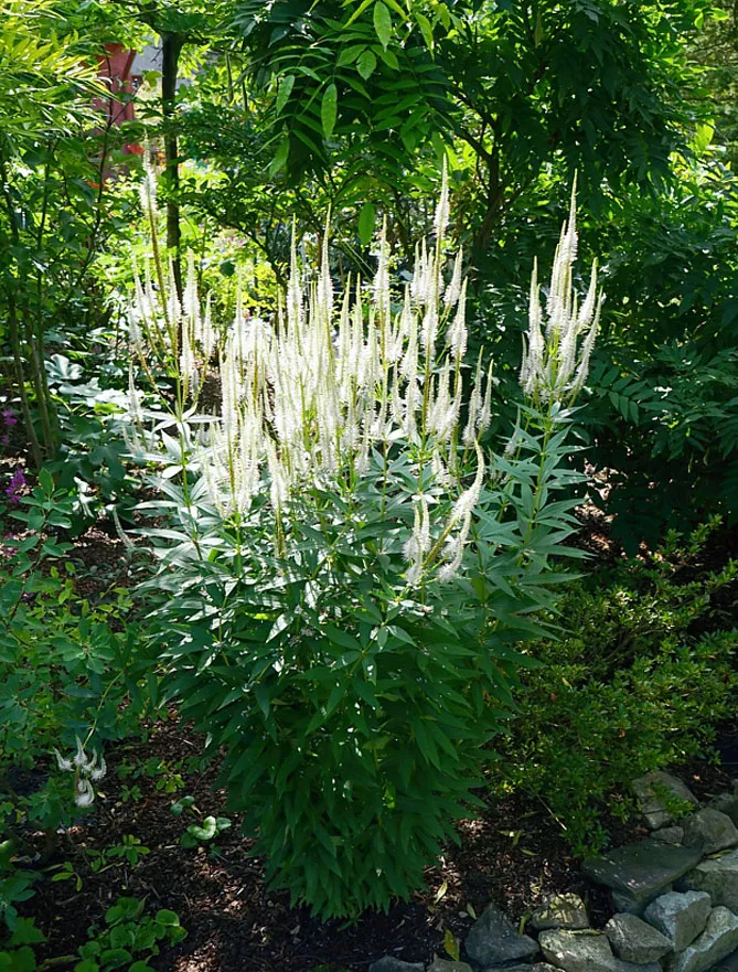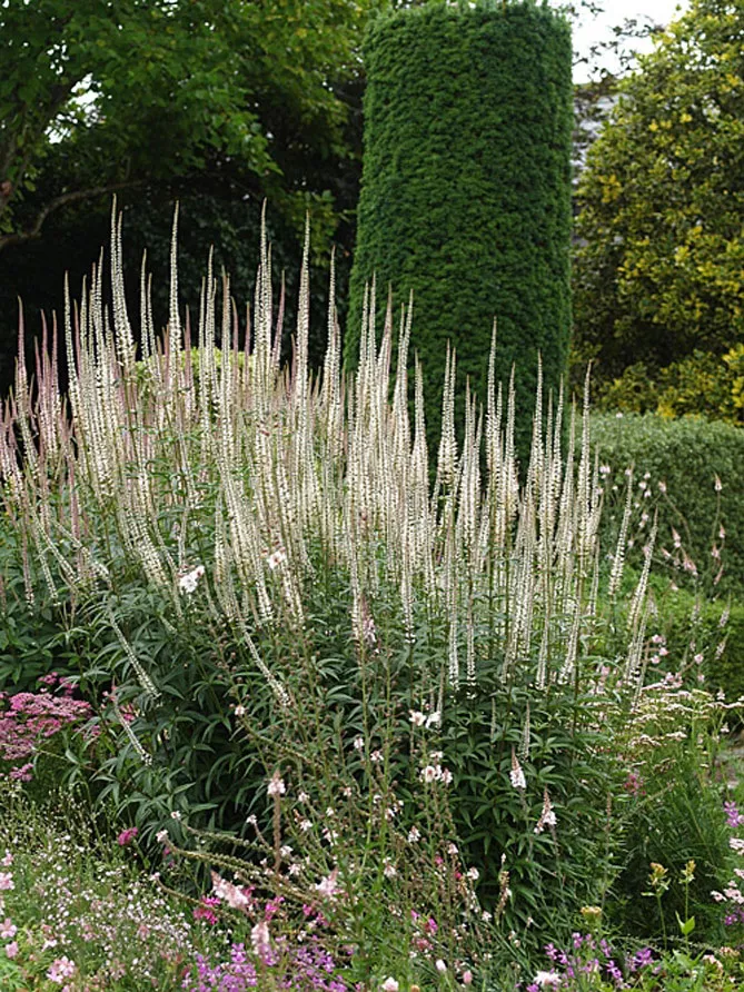 Сорт вероникаструма «Альбум» (Veronicastrum virginicum var. Album) цветет с июля по сентябрь. Высота – 1,2 м. Хорошо подходит для легкого сопровождения декоративных растений с яркими цветами и светлой листвой. Идеален в задней части клумб.