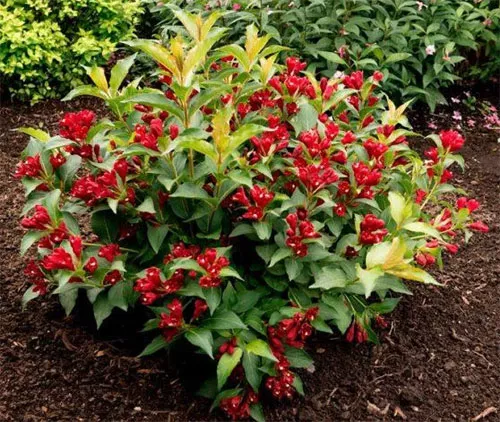 | Вейгела «Бристоль руби» (Bristol Ruby). Высокий сорт (2 метра) с красными цветами, обильными и долго цветет. Цветет в июне и августе. Показывает высокую устойчивость к морозам, болезням, вредителям. | ![]() |