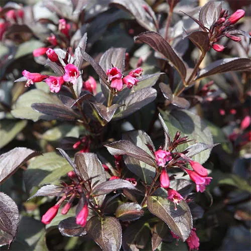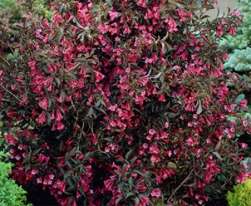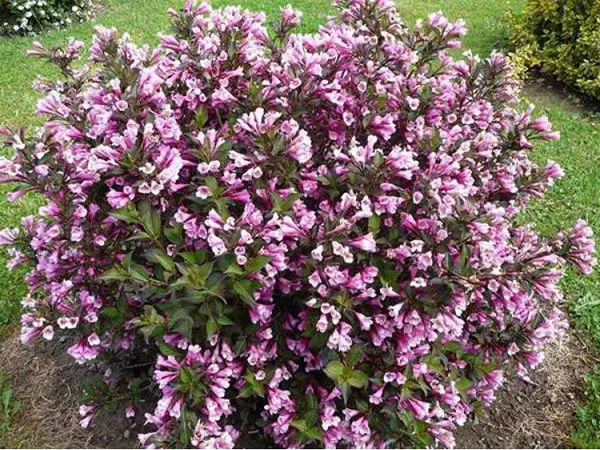 | Вейгела «Нана Пурпуреа» (Nana Purpurea). Карликовый сорт Нана пурпурная подойдет если места в саду мало, его высота редко достигает 1,5 м. Цветы выделяются интенсивным темно-розовым цветом. | ![]() |