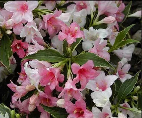 | Заслуживают внимания сорта «Brigela» и «Aureovariegata», листья которых украшены светло-желтыми полосками по краям. Их цветы розовые, очень выразительные на фоне более светлых листьев. | ![]() ![]() |