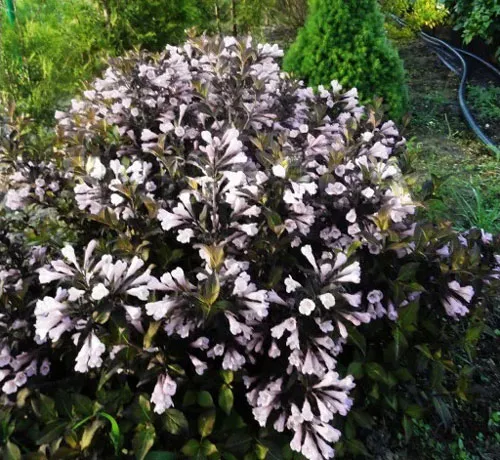 | Вейгела «Александра» (Alexandra). Характеризуется меньшей высотой, более компактной кроной. Кусты высотой 2 метра. Сорт отличают уникальные фиолетовые листья. | ![]() |