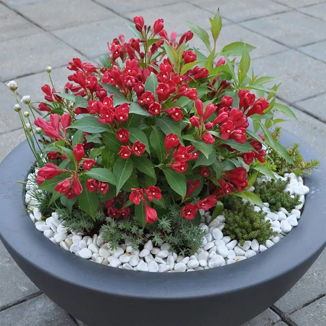 Вейгела очаровывает богатством нежных цветов, которые могут быть белыми, розовыми, красными или желтыми в зависимости от вида и сорта. Куст лучше растет в солнечном месте, хотя некоторые сорта также допускают полутень. Это растение можно сажать в горшки и на клумбы. Особенно эффектно смотрится куст, посаженный в виде живой изгороди. Кусты с компактной кроной, украшенные многочисленными цветами, создают идеальные изгороди в саду.