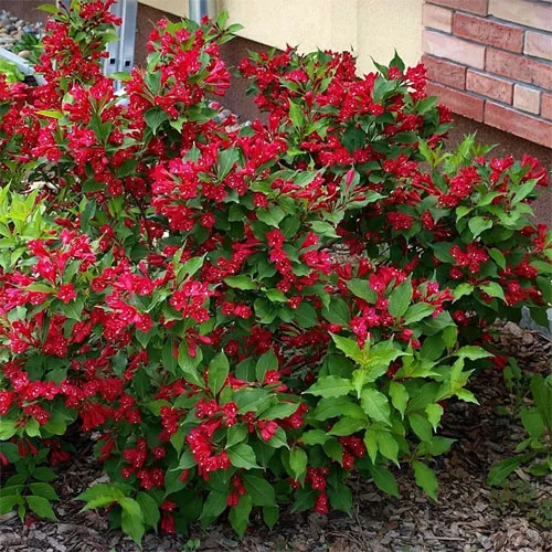 | Вейгела «Ред принц» (Red Prince). Медленнорастущий, густой кустарник, растущий до 1,5 м. Зеленые листья, красные колоколообразные цветки появляются с июня по сентябрь. Предпочитает солнечные или слегка тенистые места. Морозостойкость: -20 °С. | ![]() |