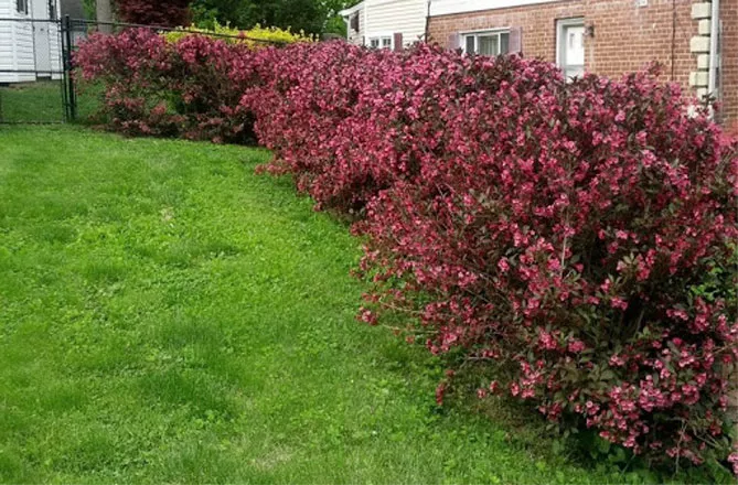 - Для живой изгороди. У кустарников не очень компактная крона, они часто используются для живой изгороди, которая является декоративной границей между участками, а не фактическим разделением. Вейгелы хороши в роли живой изгороди, декоративность им придают длинные, зубчатые листья интенсивно окрашенные в зеленый цвет с привлекательным блеском. Кроме того, они слегка свисают на тонких ветвях.