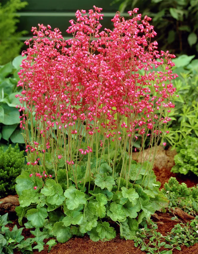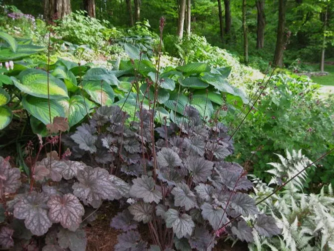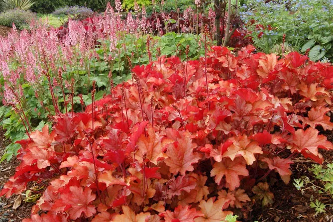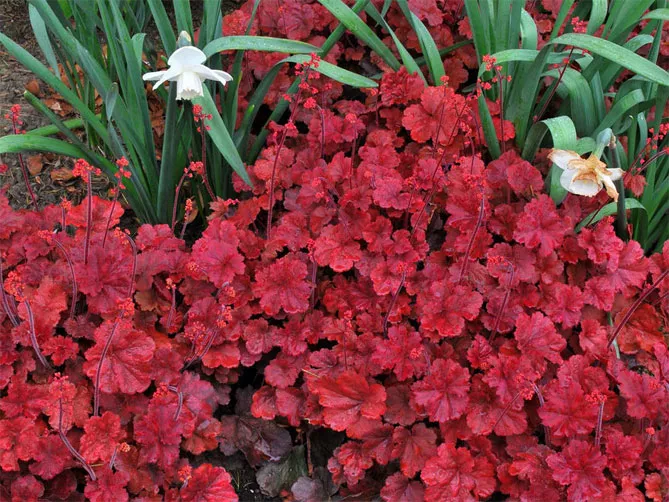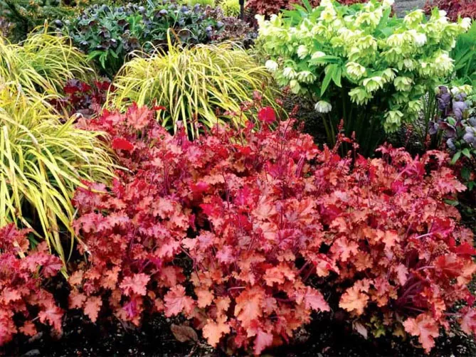 Autumn leaves – яркий, красноватый цвет листвы весной меняется на темно-красный. Гейхера создает идеальный контраст с другими растениями.