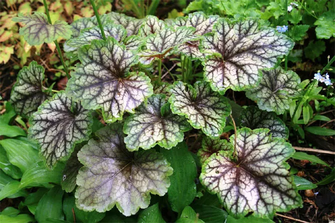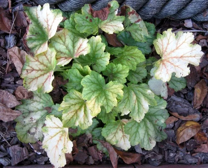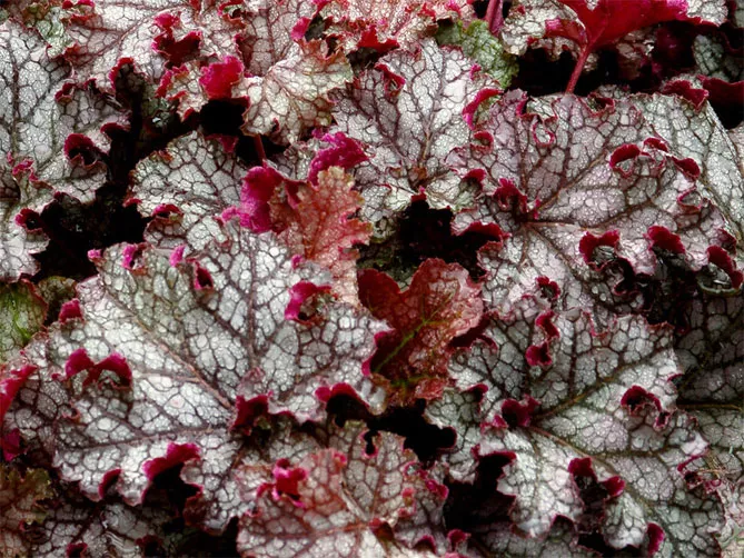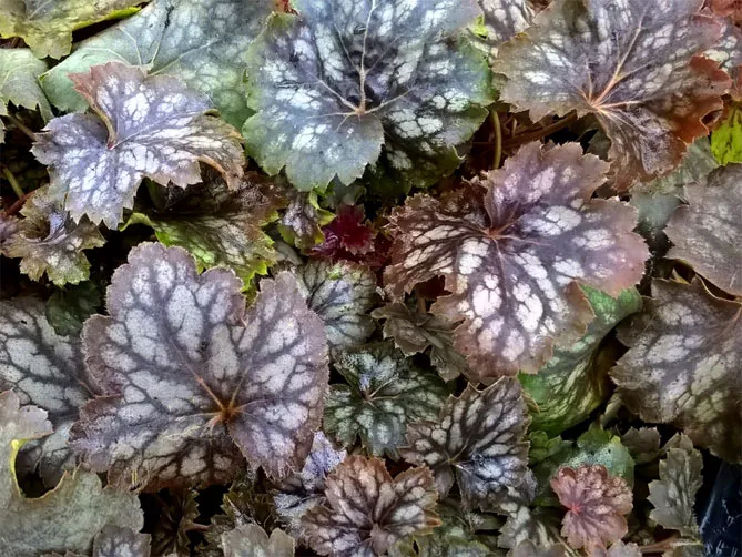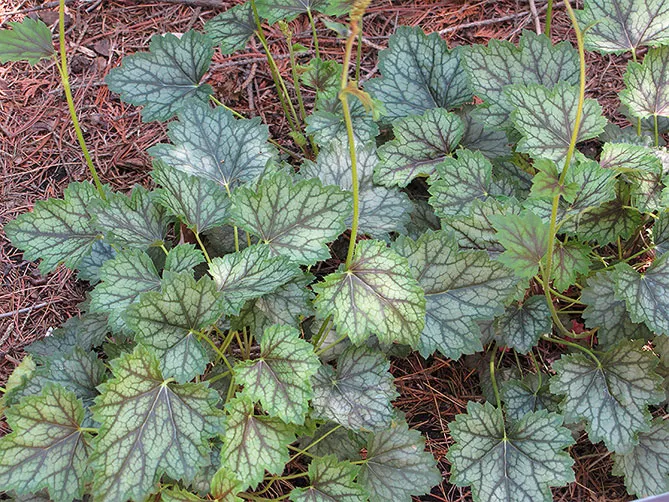 Один из лучших сортов гейхеры с листьями серебристо-зеленой окраски. Главный сортовой признак характерные прожилки темно-коричневого цвета. Цветы молочно-белого цвета. Цветение приходится на начало лета.