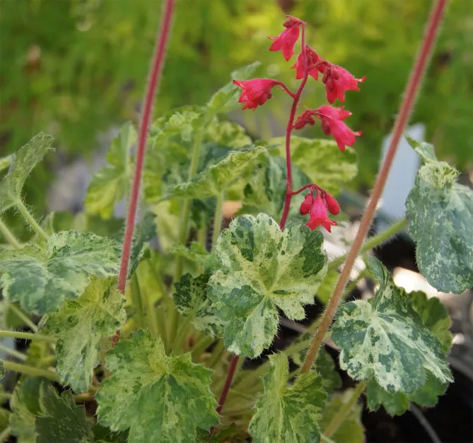 Листовые пластины изумрудно зеленого цвета с характерным мраморным рисунком. Высота кустов около 35 см. В начале июня гейхера выбрасывает высокие цветоносы с кисточками ярко-красных цветов.