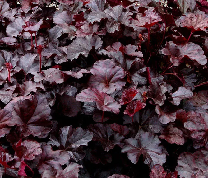 Мелкоцветковый сорт с бордовыми листьями. К осени листья приобретают более насыщенный оттенок. Растения невысокие, компактные. Края листовых пластин сильно изрезанные, волнистые. Гейхера Мелтинг файер отлично подходит для создания контрастных композиций и одиночных посадок.