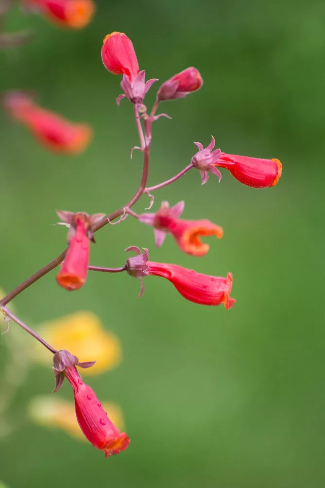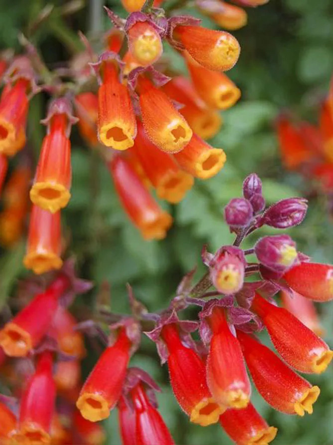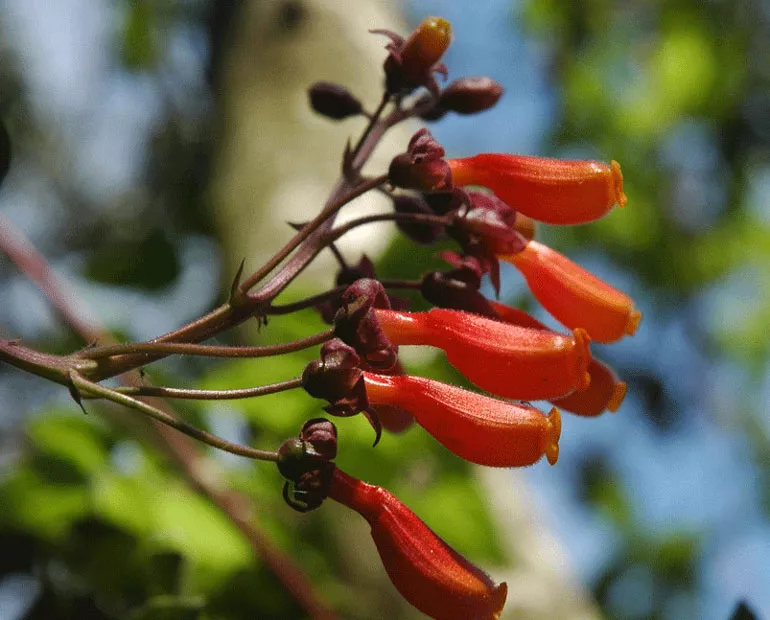 - Цветы. Летом эккремокарпус дает соцветия, состоящие из десятков трубчатых ароматных цветков, диаметром 1-2 см, располагающихся односторонне. Цветки с луковичными трубчатыми венчиками заканчиваются 5 довольно короткими лепестками. Окраска цветков варьируется от желтой до ярко-красной в зависимости от сорта, у типового вида темно-оранжевая.