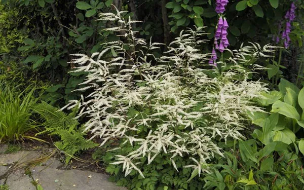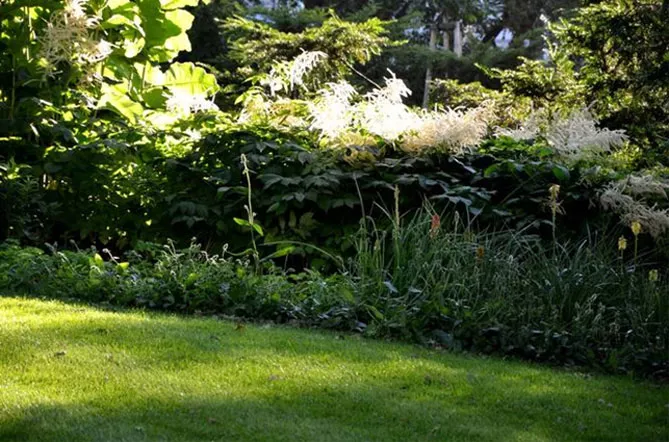 - Хорошо будет смотреться под большими деревьями – длинные кремовые или белые соцветия осветлят тенистые места, а листья и цветы заполнят пробелы под кронами деревьев.