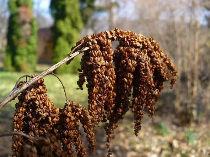Поскольку мужские цветки имеют многочисленные тычинки на длинных нитях, выходящих за пределы лепестков, их метелки в период цветения более пушистые. Поэтому большинство выращиваемых волжанок – мужские. Женские экземпляры выглядят интереснее после закладки семян, когда довольно жесткие побеги красиво свисают под тяжестью огромных гроздей плодов.