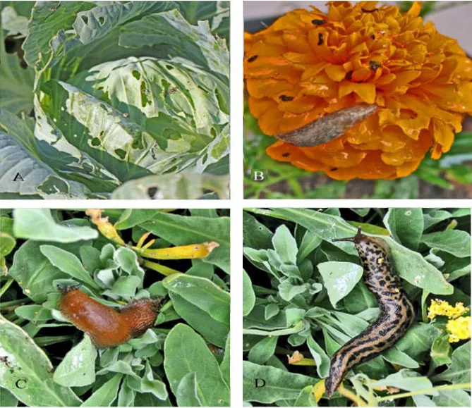 Фото. А – симптомы появления слизней, Б – сетчатый слизень, С – рыжий слизень, Г – большой слизень.