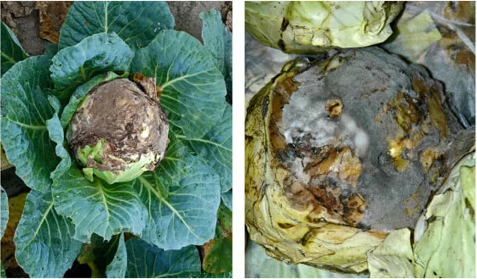 Фото. Серая гниль на капусте в начальной стадии развития и сильно пораженные кочаны