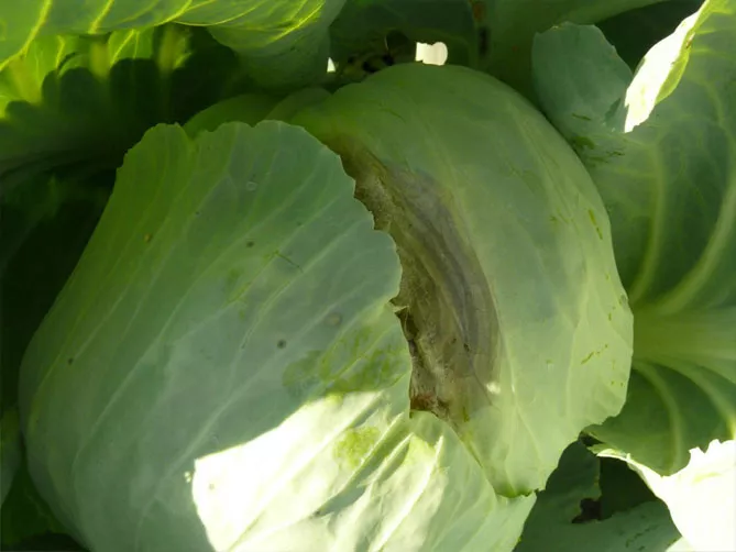 - Пятна появляются и в предуборочный период на покровных листьях кочанов.