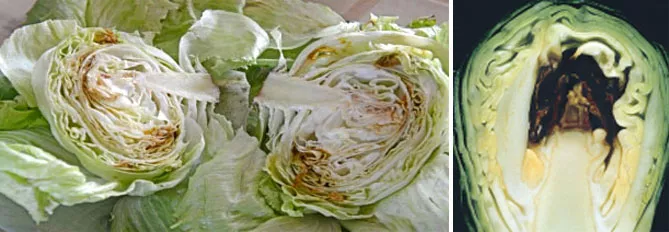 - Помимо пожелтения листьев капусты от болезни, характерным признаком является почернение проводящих сосудов, прогрессирующее вглубь растения, что и дало название заболеванию. На поперечном срезе кочана видны чернеющие слои листьев.