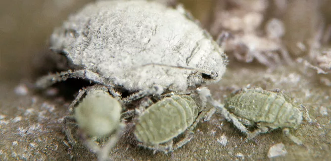 - Бескрылые особи длиной туловища 2-2,6 мм, зелено-желтой окраски с двумя рядами темных пятен на спинной стороне брюшка, тело покрыто серо-белым восковым налетом.