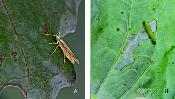 Фото. Капустная моль: A — бабочка, B – гусеница.