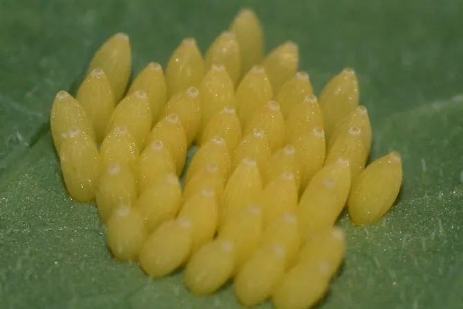 - Яйца бутылковидной формы, высотой 1,4 мм, ребристые, ярко-желтого цвета, перед вылуплением ярко-оранжевые, откладываются на листьях группами по 40-100 штук.