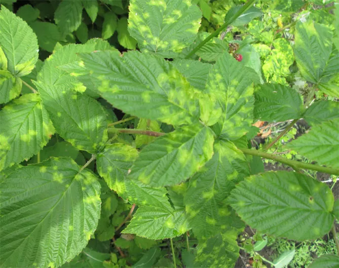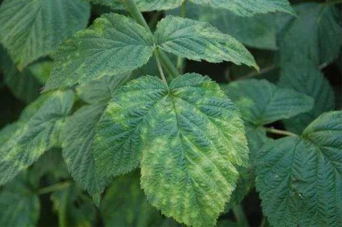 На фотографии представлены симптомы вертициллеза малины –небольшие желтоватые пятна неправильной формы между жилками листьев.
