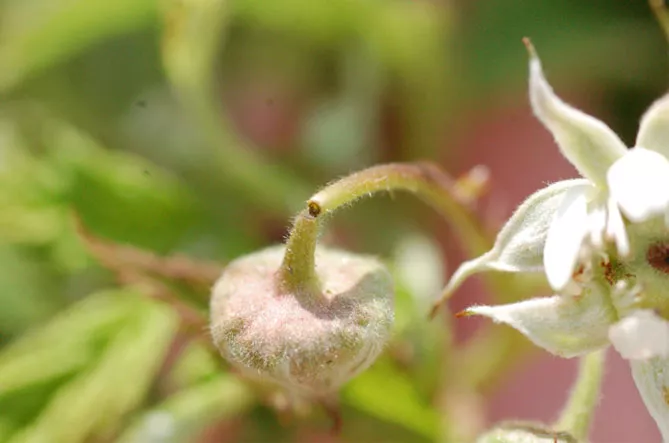 - На инфицированных ягодах малины болезнь проявляется пятнами гниения, на них появляется белый налет мицелия, который постепенно покрывается серым пыльным налетом, состоящим из спор конидий. Эти споры способствуют дальнейшим инфекциям, поэтому патоген быстро распространяется от инфицированного плода при контакте с другими частями растения.